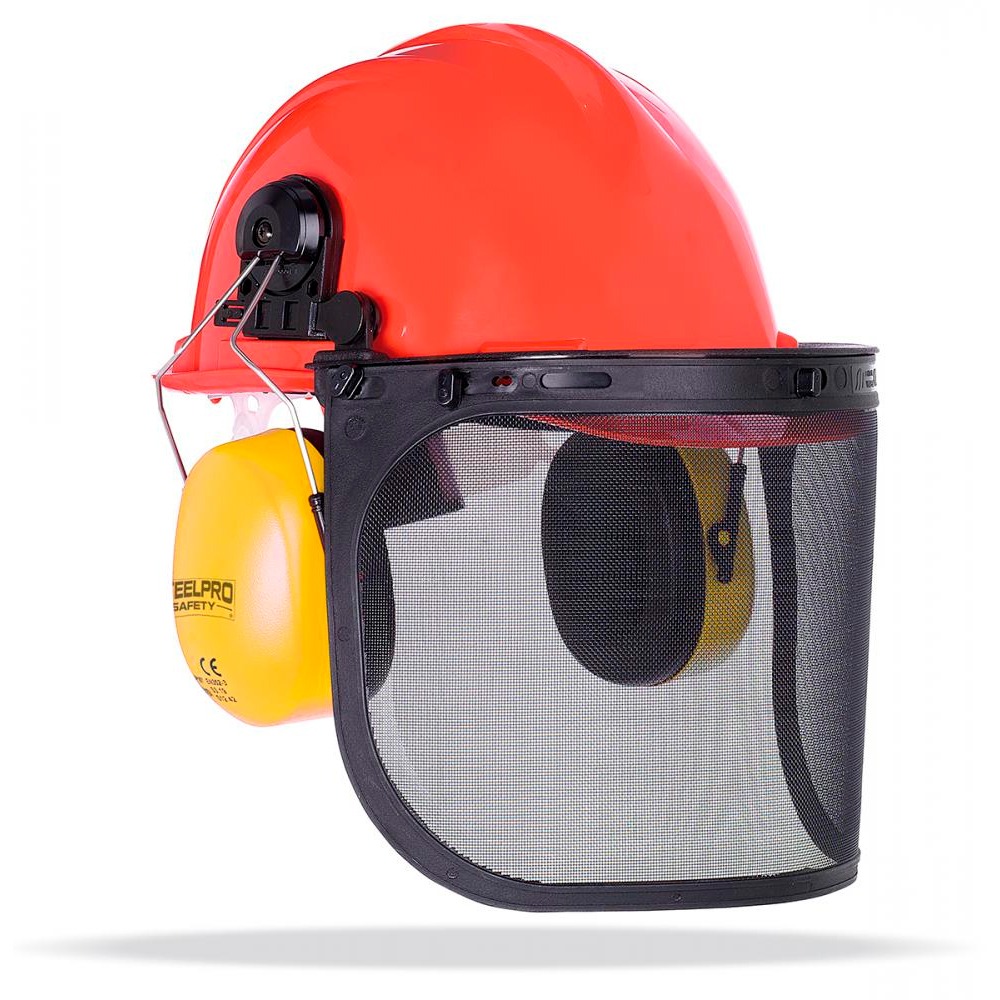 Casco de protección para la industria (EN397) fabricado en PP de color naranja. Cierre mediante ruleta que regula el contorno de 55 a 62 cm. Arnés interior en plástico con banda antisudor con 4 puntos de anclaje. Ajuste mediante ruleta tipo “roller”. Visor de rejilla y adaptador para trabajos forestales y de jardinería. Orejera de atenuación media (SNR 26dB). EN397 Casco de protección para la industria. EN166 Protección ocular de los ojos. Requisitos generales. EN1731 Protectores oculares y faciales de malla. EN352-3 Protección auditiva. Orejeras acopladas a un casco de protección..