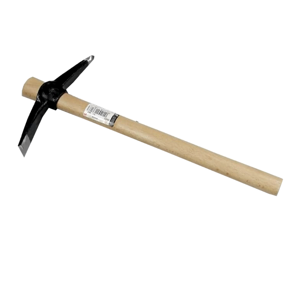 Martillo con cabeza de acero forjado que tiene un extremo con forma de hacha y otro con forma de pico, también dispone de un anillo en medio donde se asegura el mango.