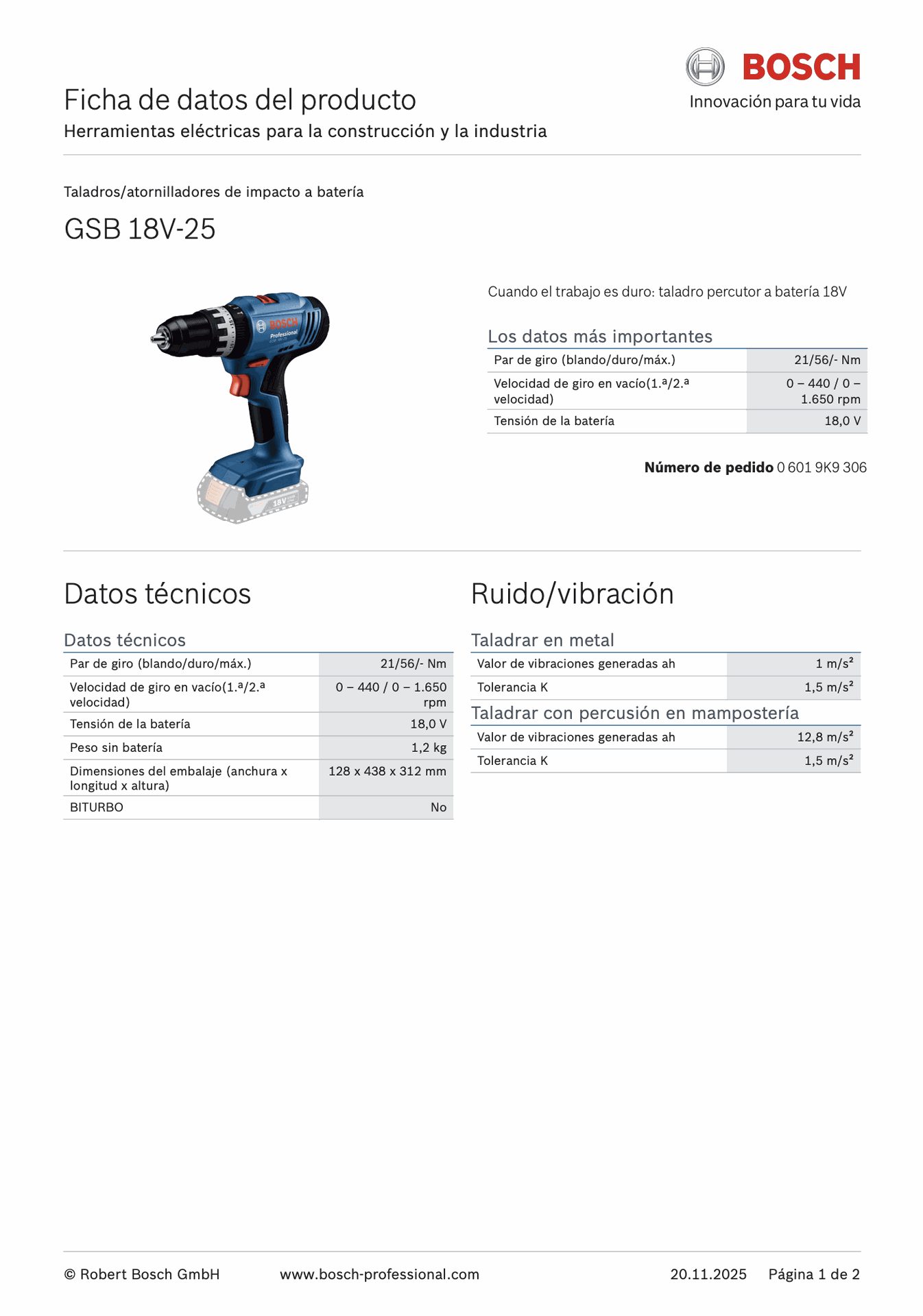 TALADRO CON PERUSIÓN A BATERÍA GSB 18V-25 REF. 06019K9306