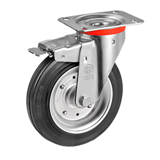 Rueda de goma estándar, con dureza 80 shore A. Núcleo de Chapa galvanizada eletroliticamente, que se obtiene mediante remachado de dos llantas. Buje liso autolubricante de poliamida. Soporte giratorio con pletina y freno delantero.