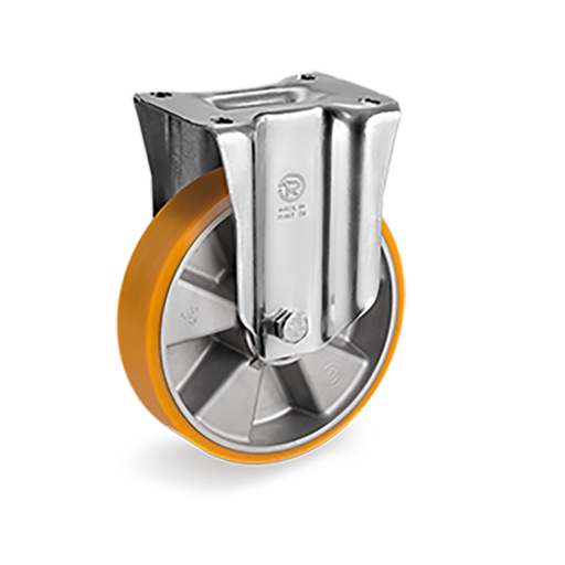Rueda de poliuretano termoplástico con núcleo de poliamida 6, anti- huella, dureza 85 shore A, buena resistencia al desgaste y al desgarre. Soporte fijo.