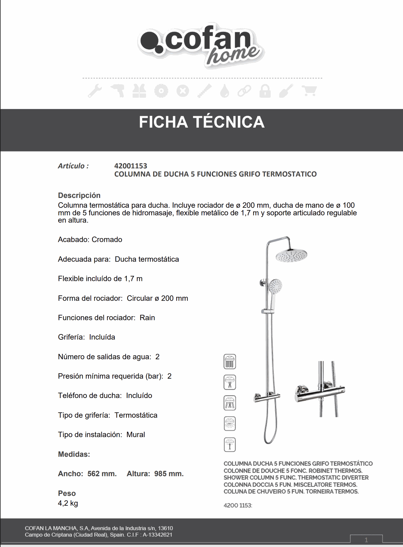 La columna de ducha contiene grifo termostático de latón, cabezal de la ducha extraplano con salidas de agua antical.