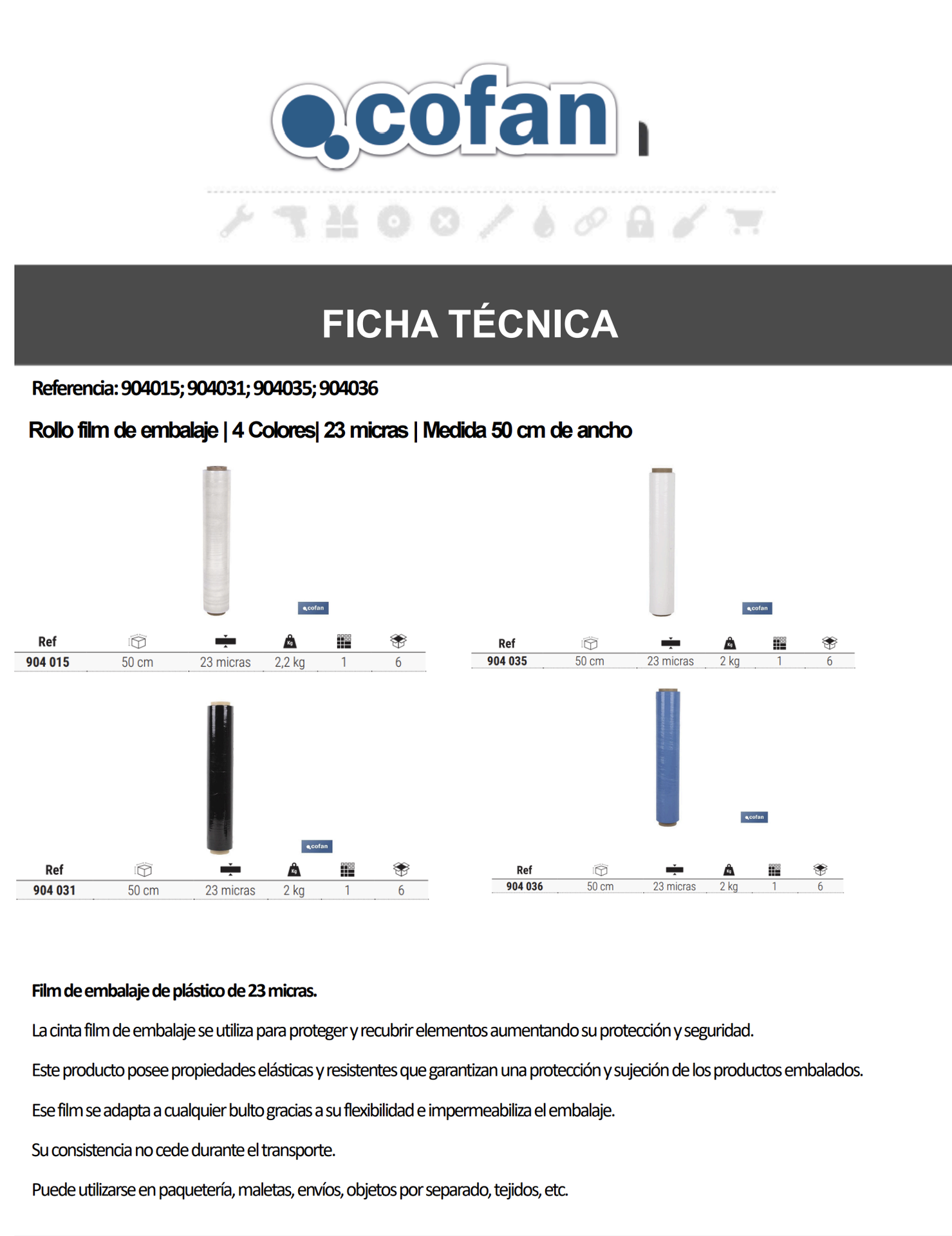 Film de embalaje de plástico de 23 micras. La cinta film de embalaje se utiliza para proteger y recubrir elementos aumentando su protección y seguridad. Este producto posee propiedades elásticas y resistentes que garantizan una protección y sujeción de los productos embalados.