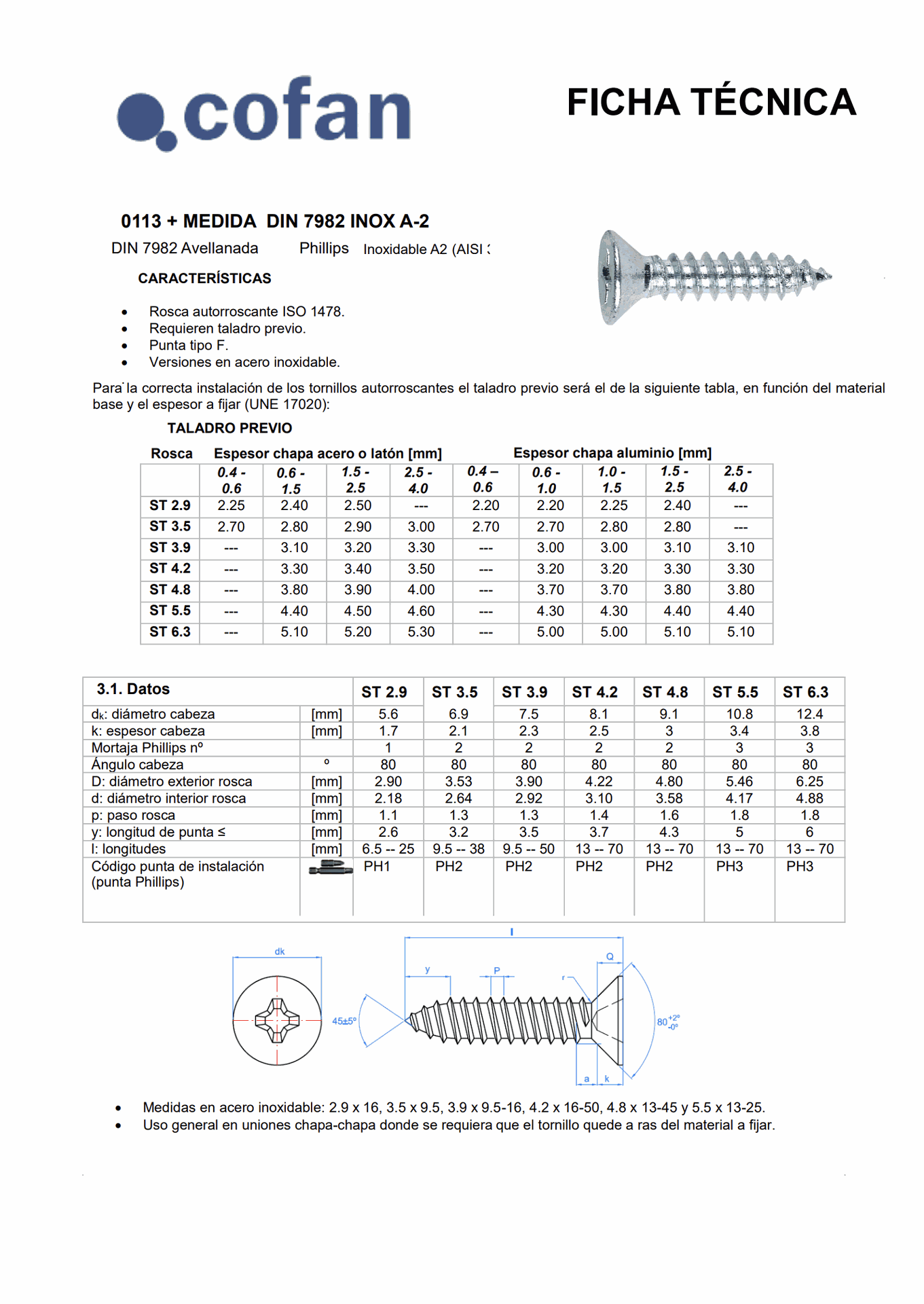 Tornillo DIN7982 rosca chapa, con cabeza avellanada y huella PH.