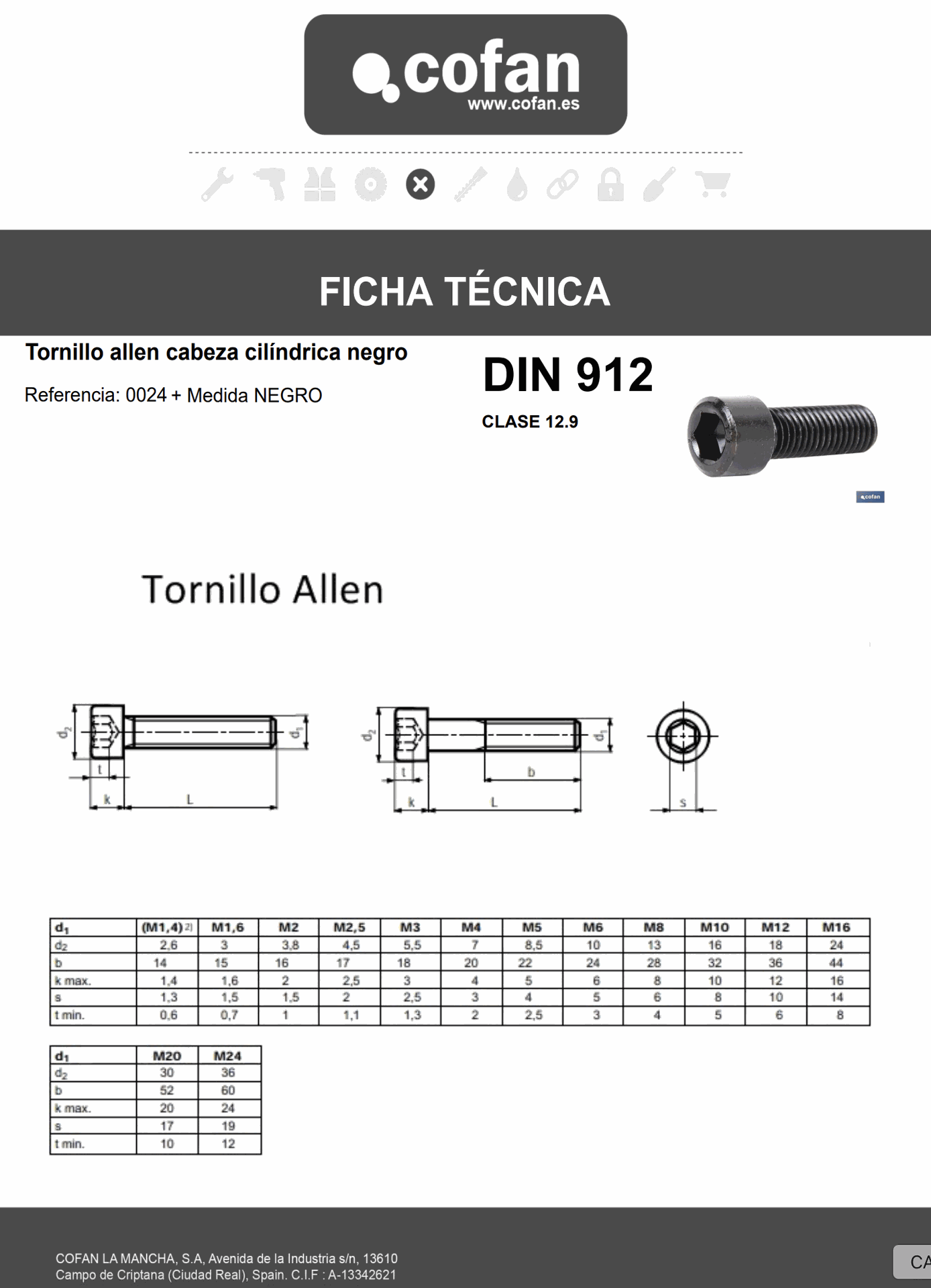 Tornillo Allen DIN 912 Cabeza Cilindrica Clase 12.9 Negro Ø10