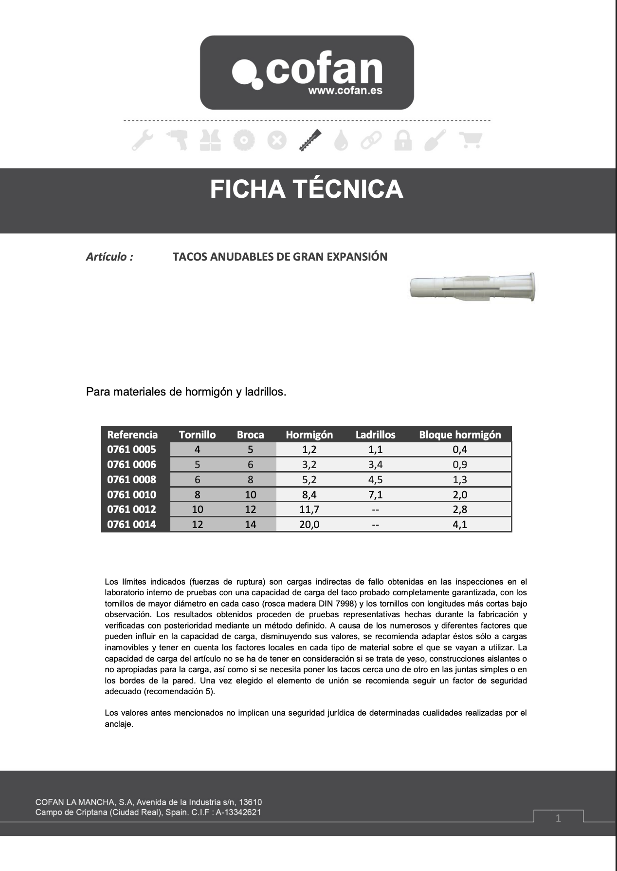 Con collarín para evitar que se cuele en el interior del material base durante la instalación. Aletas laterales anti giro, para evitar el giro del taco durante la formación del nudo. Apto tanto para material base macizo, hormigón, piedra, ladrillo macizo, etc. Como hueco, ladrillo hueco, bloque hueco, etc. Usarlo con tirafondo tipo o tornillos barraqueros. Para fijación de verjas, barandillas, soportes, estanterías, rótulos, sanitarios, etc. En materiales huecos el interior del taco forma un nudo al expansionarse que permite la fijación.
