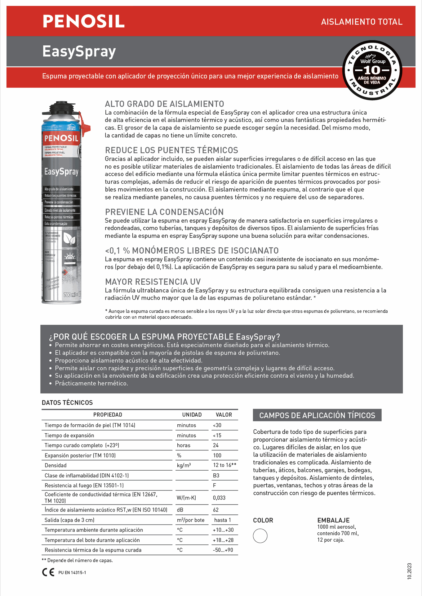 Se puede utilizar la espuma en superficies irregulares o redondeadas, como tuberías, tanques y depósitos de diversos tipos. El aislamiento de superficies frías mediante la espuma en EasySpray supone una buena solución para evitar condensaciones. Gracias al aplicador incluido, se pueden aislar superficies irregulares o de difícil acceso en las que no es posible utilizar materiales de aislamiento tradicionales. Se puede aplicar sobre, madera, hormigón, ladrillo, la mayoría de metales, placas de yeso, poliestireno expandido, tejas, pvc.. Se puede utilizar tanto en interior como exterior. Es pintable. Temperatura del aire durante la aplicación +10ºC a +30ºC. Resistencia tërmica de la espuma curada: entre +50ºC a +90ºC. Aproximadamente el bote cunde 1m2..