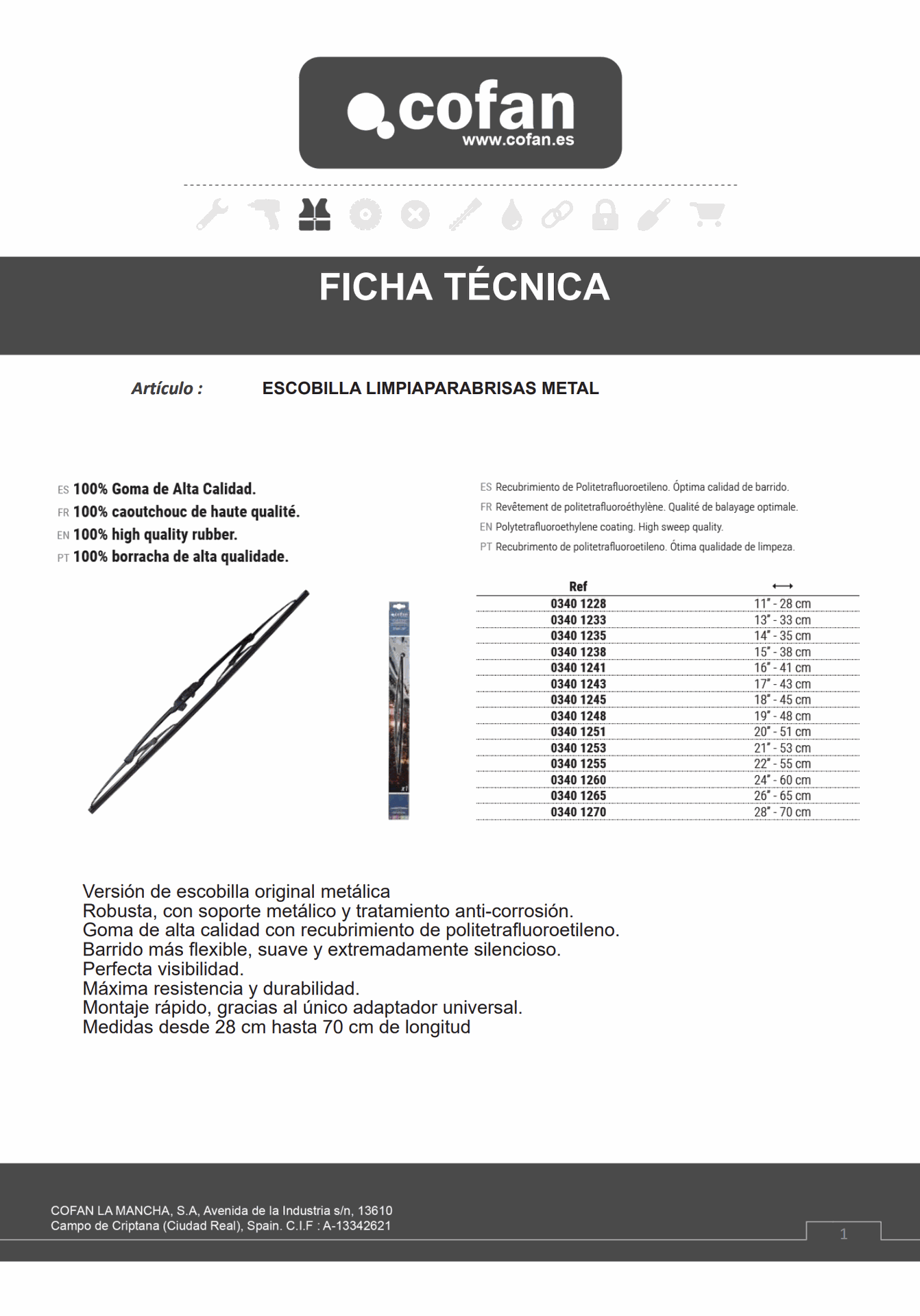 Escobilla limpiaparabrisas metal fabricada en 100% goma de alta calidad, con recubrimiento de politetrafluoroetileno.