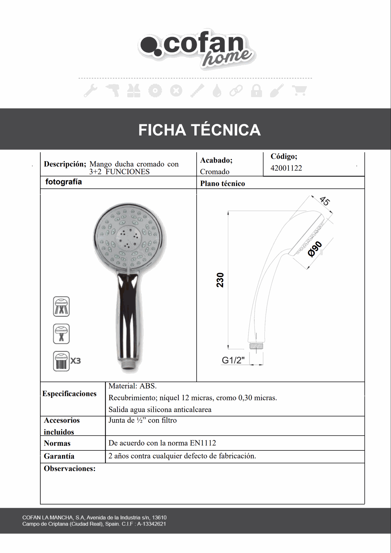 Provisto de salidas de agua anti cal. Las medidas del mango de 5 funciones son de 22 x 10 cm. Es muy ligero y cuenta con una sencilla y fácil instalación.