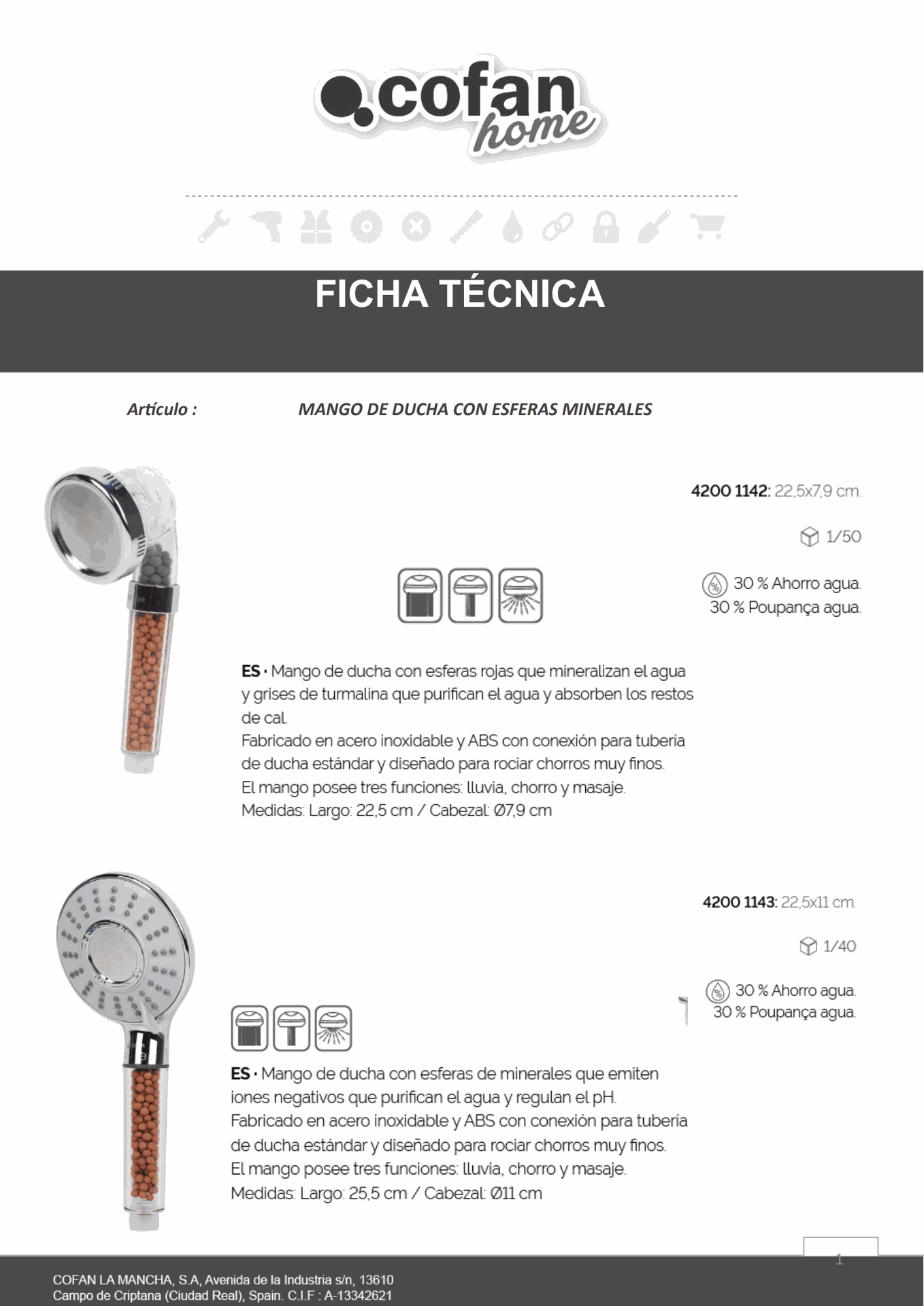 Mango de Ducha Ionica con Esferas Minerales 3 Funciones Ref. 42001143