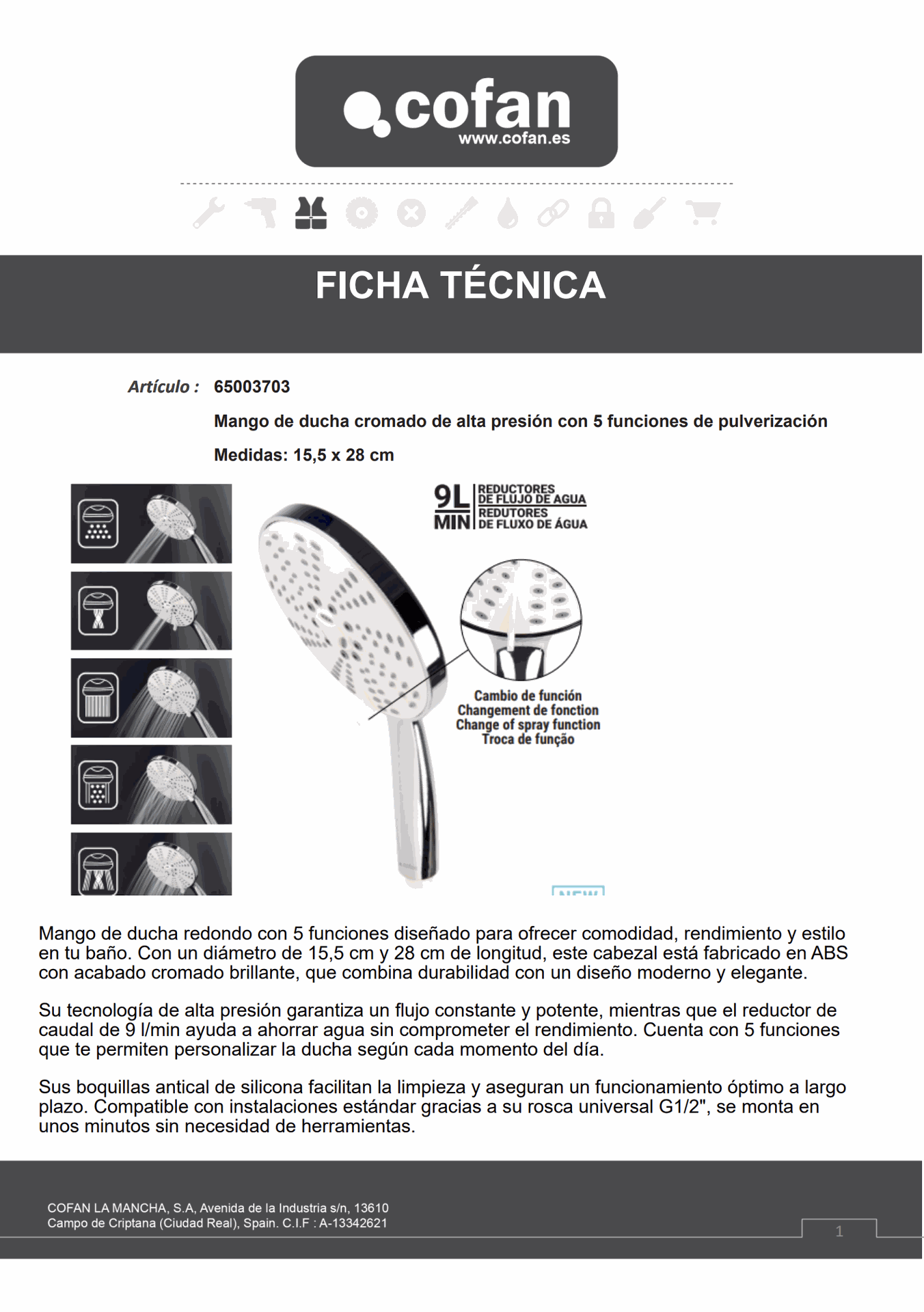 MANGO DE DUCHA REDONDO CROMADO 5 FUNCIONES REF.65003703