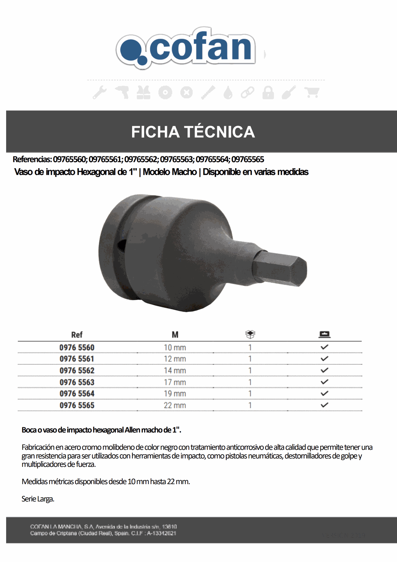 Fabricación en acero cromo molibdeno de color negro con tratamiento anticorrosivo de alta calidad que permite tener una gran resistencia para ser utilizados con herramientas de impacto, como pistolas neumáticas, destornilladores de golpe y multiplicadores de fuerza.