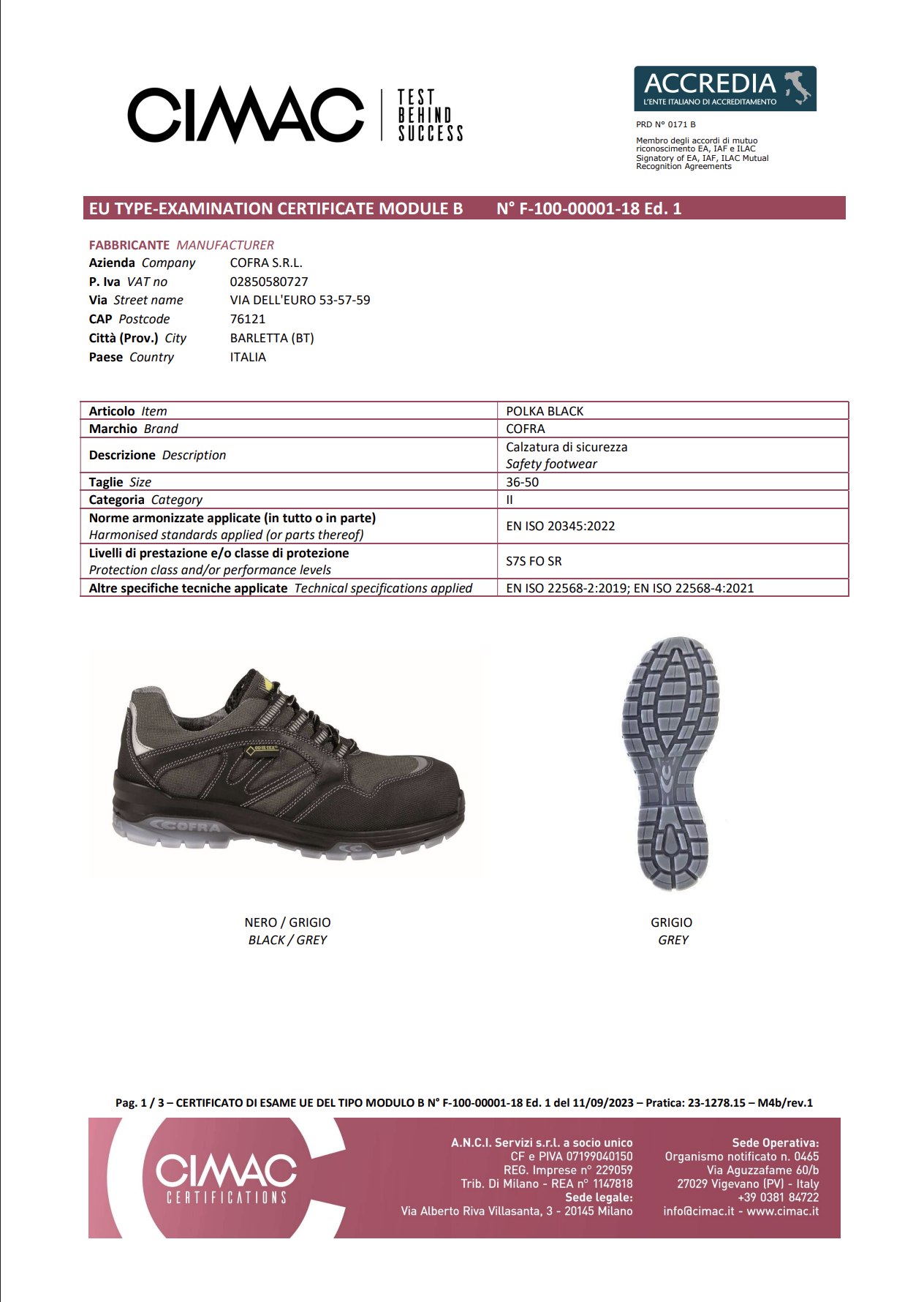 Polka Negro S7 zapato en tejido transpirable y piel flor hidrófuga, color negro/gris, con forro en membrana GORE-TEX. Extended Comfort Footwear, antiestático, antishock, antideslizante, con lámina anti penetración, no metálica APT Plate.
