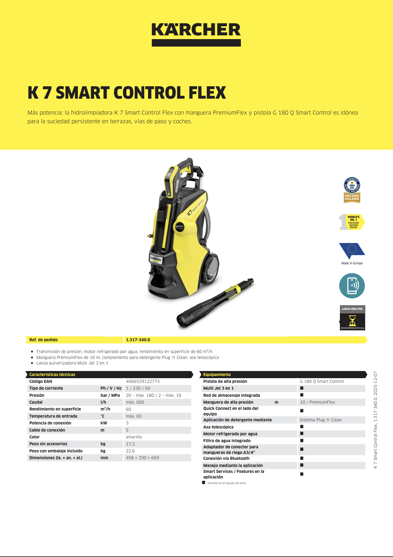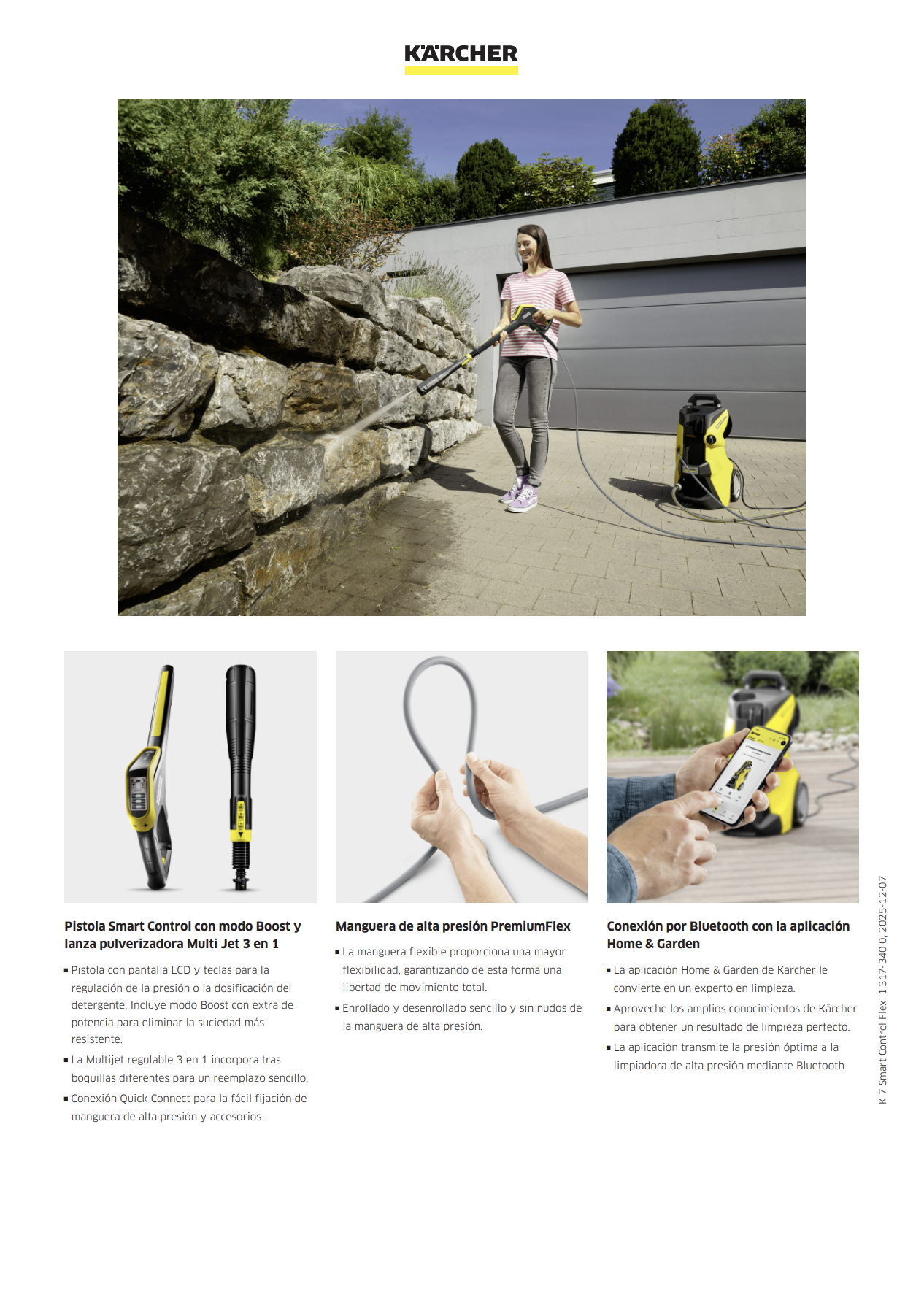 La K 7 Smart Control Flex de Kärcher es una hidrolimpiadora eléctrica de alta presión diseñada para eliminar suciedad fuerte y persistente en exteriores, como terrazas, caminos, paredes, muebles, herramientas de jardín, coches y autocaravanas.
