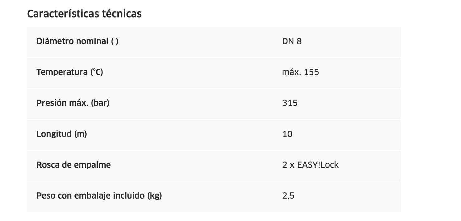 Manguera de alta presión (DN 8) adecuada para presiones de hasta 315 bares, 10 m de longitud.