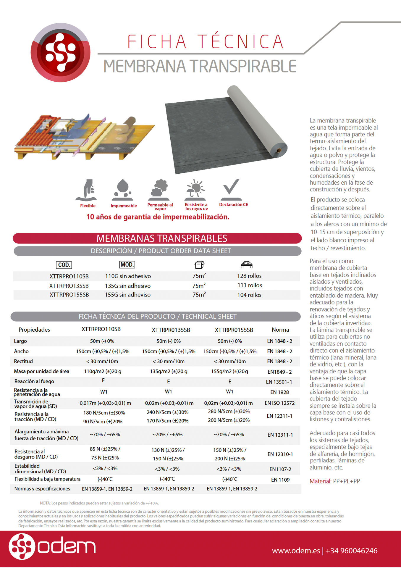 Membrana multicapa impermeable y transpirable, ligera y resistente, para su colocación en tejados inclinados, compuesta de poliolefinas termoplásticas.