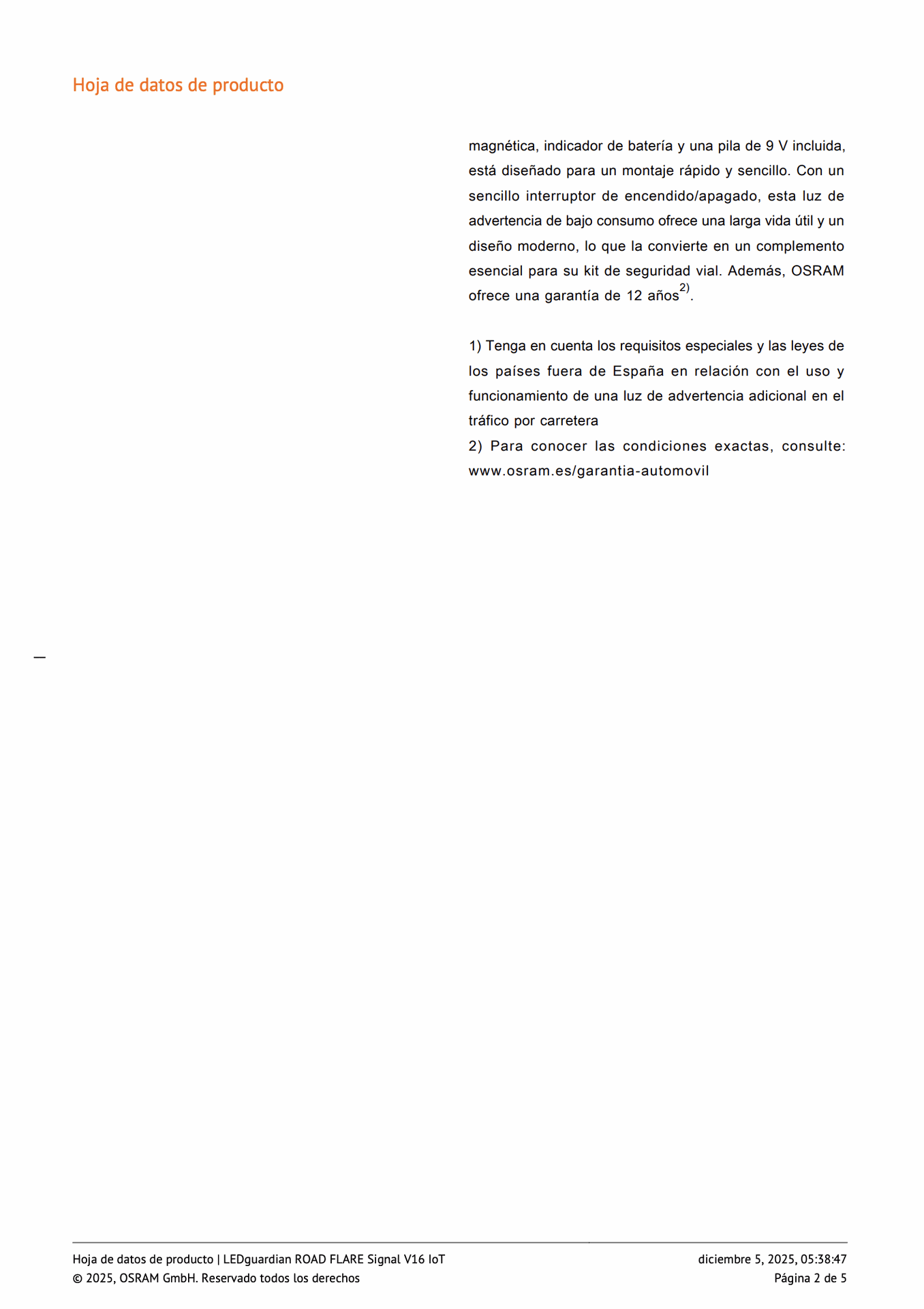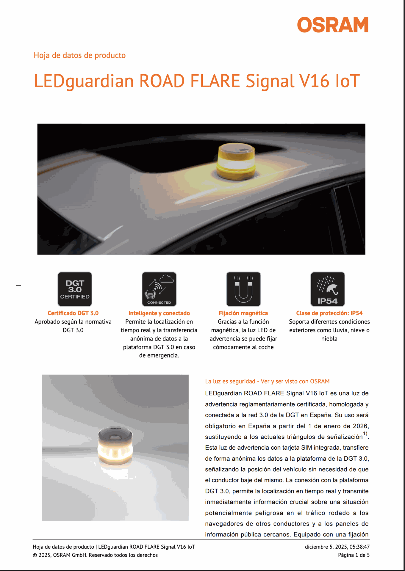 La LED guardian ROAD FLARE Signal V16 IoT es una luz de aviso legalmente requerida, certificada, homologada y conectada a la red DGT 3.0 en España. Su uso es obligatorio en España desde el 1 de enero de 2026 y sustituye a los actuales triángulos de advertencia.